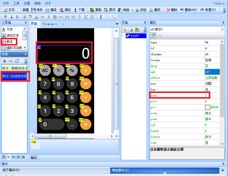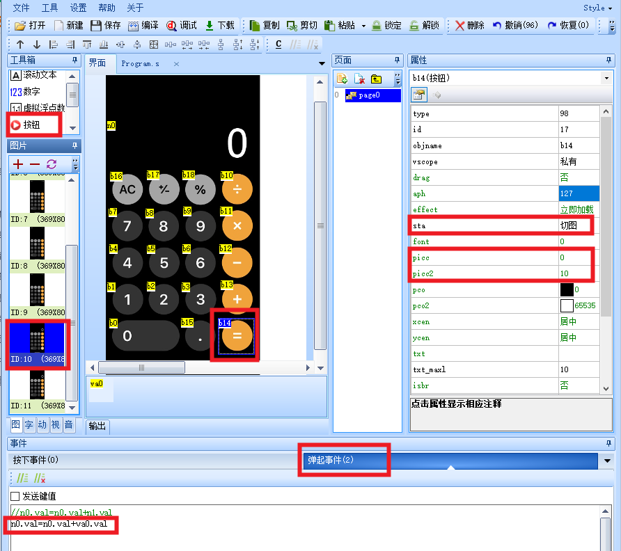 在按钮b14的弹起事件输入代码:n0.val=n0.val+va0.val