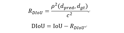 其中d_pred,d_gt分别为预测框和真实框的中心点,p为求欧氏距离,c为最小外接矩形的对角线。