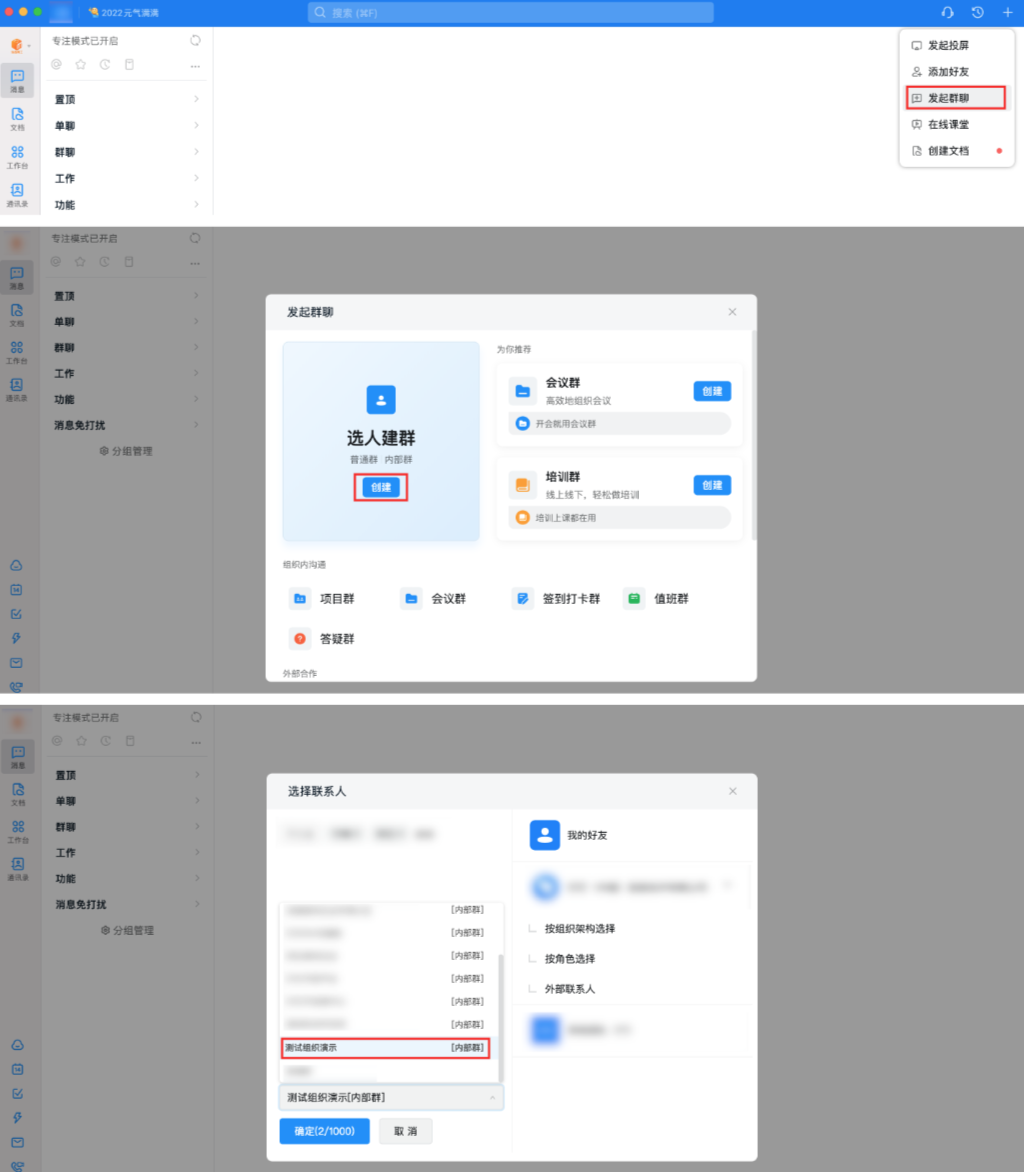 在钉钉客户端中,确保目标企业内已经存在一个企业内部群。如果没有,请手动创建一个。注意:机器人只能加入由其所在企业创建的群。