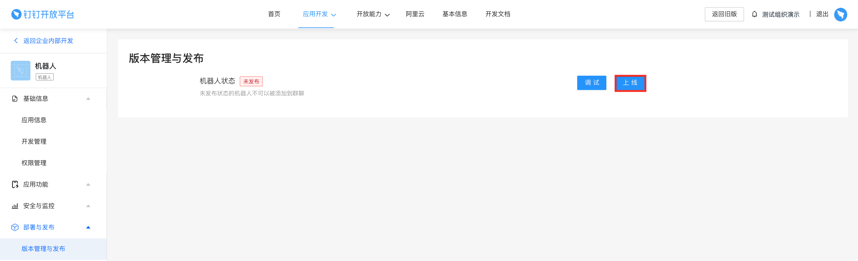 进入“版本管理与发布”页面,点击上线按钮,将机器人应用发布为“已发布”状态。只有发布后的机器人应用才能被添加到群聊中。