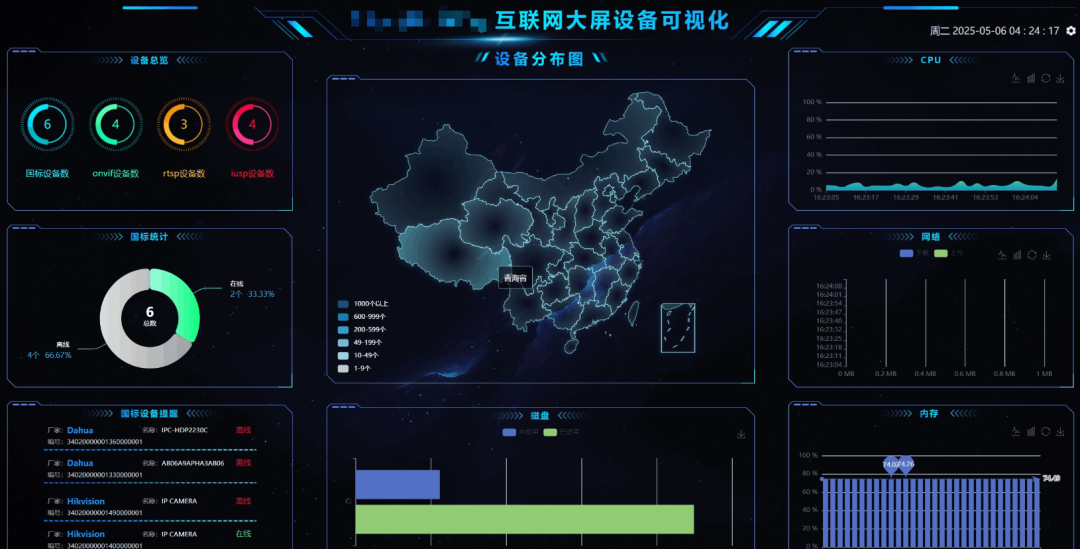 设备接入:兼容海康、大华等主流品牌设备,支持GB/T 28181、ONVIF协议接入IPC/NVR/平台。