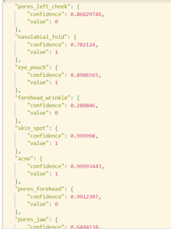 首先在测试阶段,我已经将在一定条件下的用户脸部皮肤图片转化为了json格式化数据,如下图:
