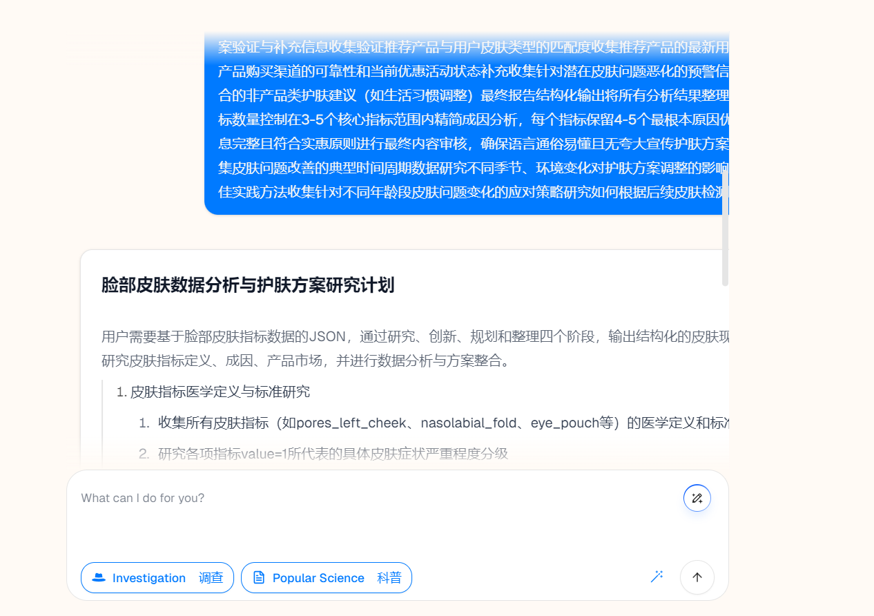 其实,在过去几个月的时间中,我也尝试了制作一些有趣的智能体来解锁一些特定场景的玩法,比如脸部皮肤分析与网页信息搜索,但是在使用Web Search MCP工具时,我也深深地尝试了很多相关的工具,整体测试效果并不算太完美,但是在看到了字节的Deep Research深度搜索项目之后,就感觉这才是我想要的Web Research工具!