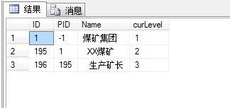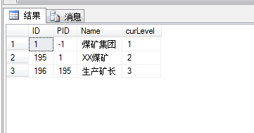 -- with一个临时表(括号中是你要查询的列名) with temp(ID,PID,Name,curLevel) as ( --1:初始查询(这里的PID=-1 在我的数据中是最底层的根节点) select ID,PID,Name,1 as level from dbo.T_ACL_OU where Deleted = 0 and PID = -1 union all --2:递归条件 select a.ID,a.PID,a.Name, b.curLevel+1from T_ACL_OU a --3:这里的临时表和原始数据表都必须使用别名,不然递归的时候不知道查询的是那个表的列 inner join temp b on ( a.PID=b.id) --这个关联关系很重要,一定要理解一下谁是谁的父节点 ) select * from temp --4:递归完成后 一定不要少了这句查询语句 否则会报错