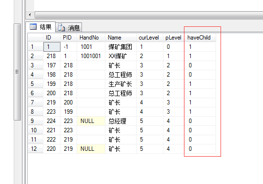 with temp(ID,PID,HandNo,Name,curLevel,pLevel,haveChild) as ( --初始查询 select ID,PID,HandNo,Name,1 as level,0 as pLevel,1 as haveChild from dbo.T_ACL_OU where Deleted = 0 and PID = -1 union all --递归条件 select a.ID,a.PID,a.HandNo,a.Name, b.curLevel+1,b.curLevel,haveChild = (case when exists(select 1 from T_ACL_OU where T_ACL_OU.PID=a.id) then 1 else 0 end) --(select 1 from T_ACL_OU where exists(select 1 from T_ACL_OU where a.PID=b.id)) from T_ACL_OU a inner join temp b on ( a.PID=b.id) ) select * from temp order by pLevel