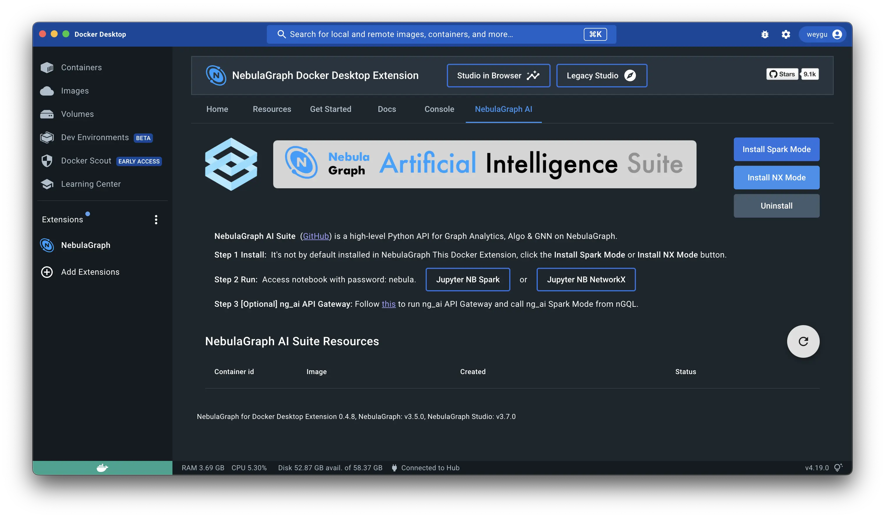 除了上面的扩展安装方法之外,你可以从 Docker 桌面版的扩展市场里搜索 NebulaGraph,一键安装本地开发环境。安装完毕之后,进入 NebulaGraph Docker 扩展内部,点击 NebulaGraph AI ,点击 Install NX Mode 安装本地的 NebulaGraph + Jupyter Notebook 开发环境。