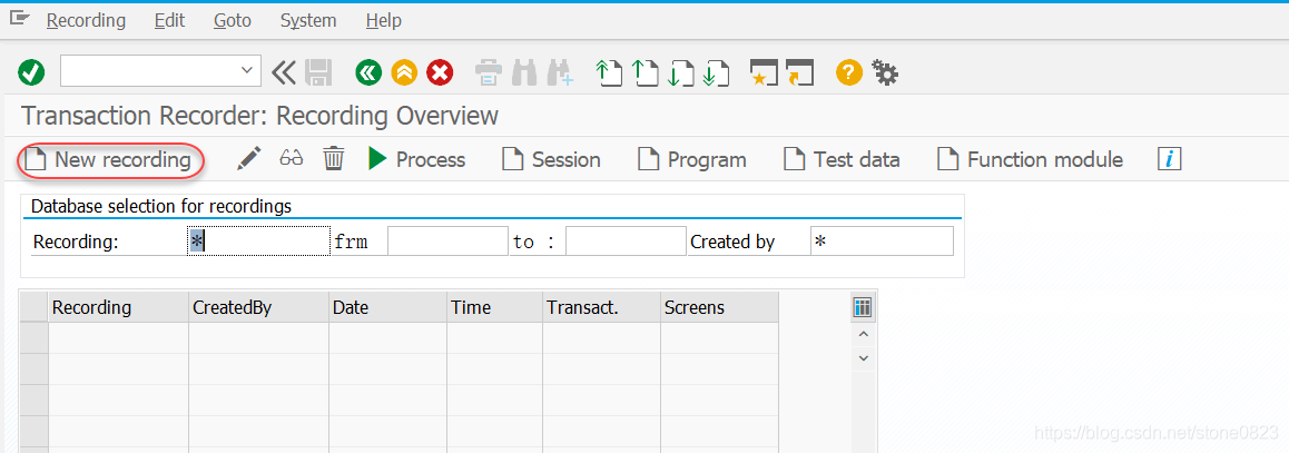 使用 BDC 前,先使用事务码 SHDB 或者 SM35 将操作过程录制下来,这里以 SHDB 为例说明。在 SHDB 界面中,点击 New Recording 按钮开始一个新的录制: