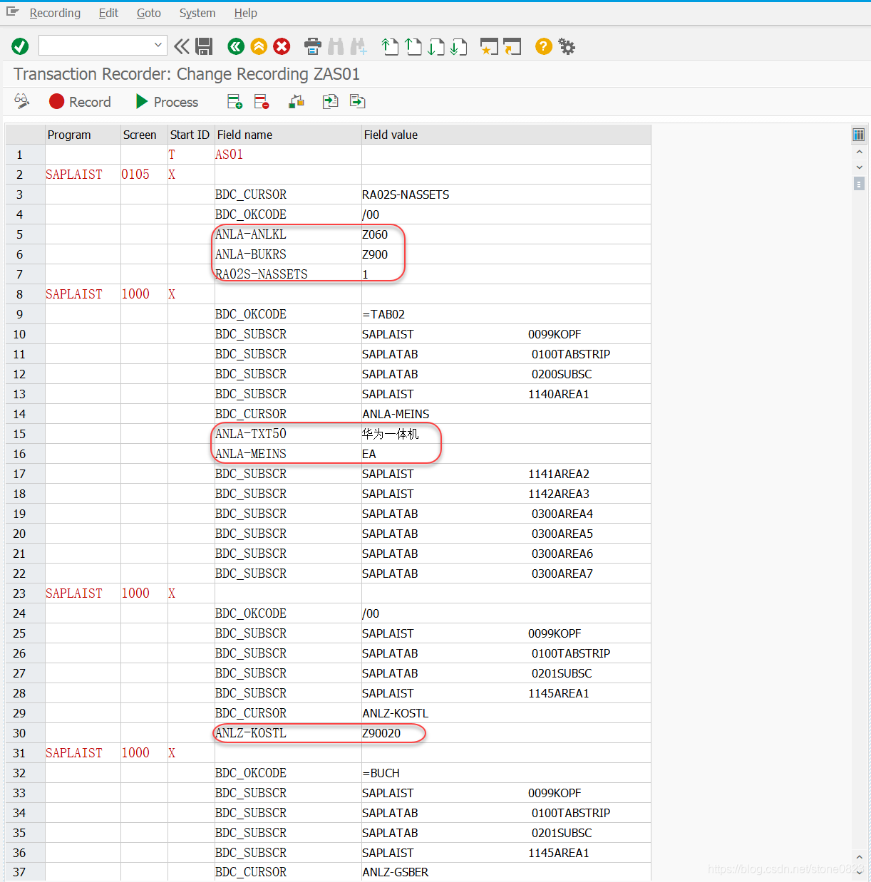 我把需要填写值的字段都已经标注了出来。可以看到,SAP 记录了操作过程中的子屏幕 (BDC_SUBSCR),也记录了光标的位置 (BDC_CURSOR),我们可以基于对 AS01 界面,删除不影响功能的一些行次。比如 BDC_CURSOR,一般是可以删除的,BDC_SUBSCR 的屏幕,如果没有需要录入任何值,也是可以删除的。删除不相关字段后,屏幕录制的代码简化为:
