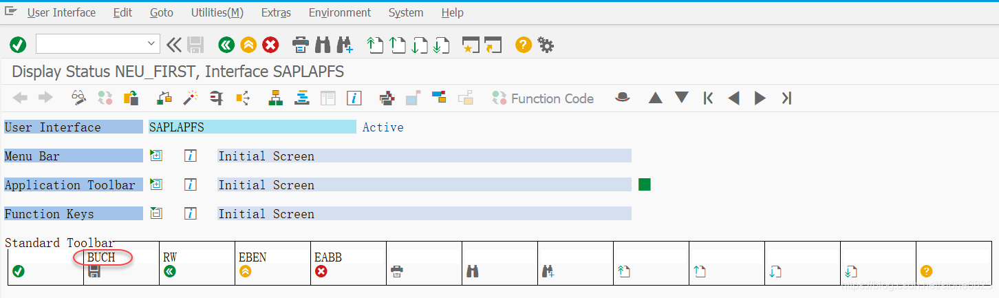 双击 GUI status NEU_FIRST,可以看到 BUCH 对应的功能是保存的意思。