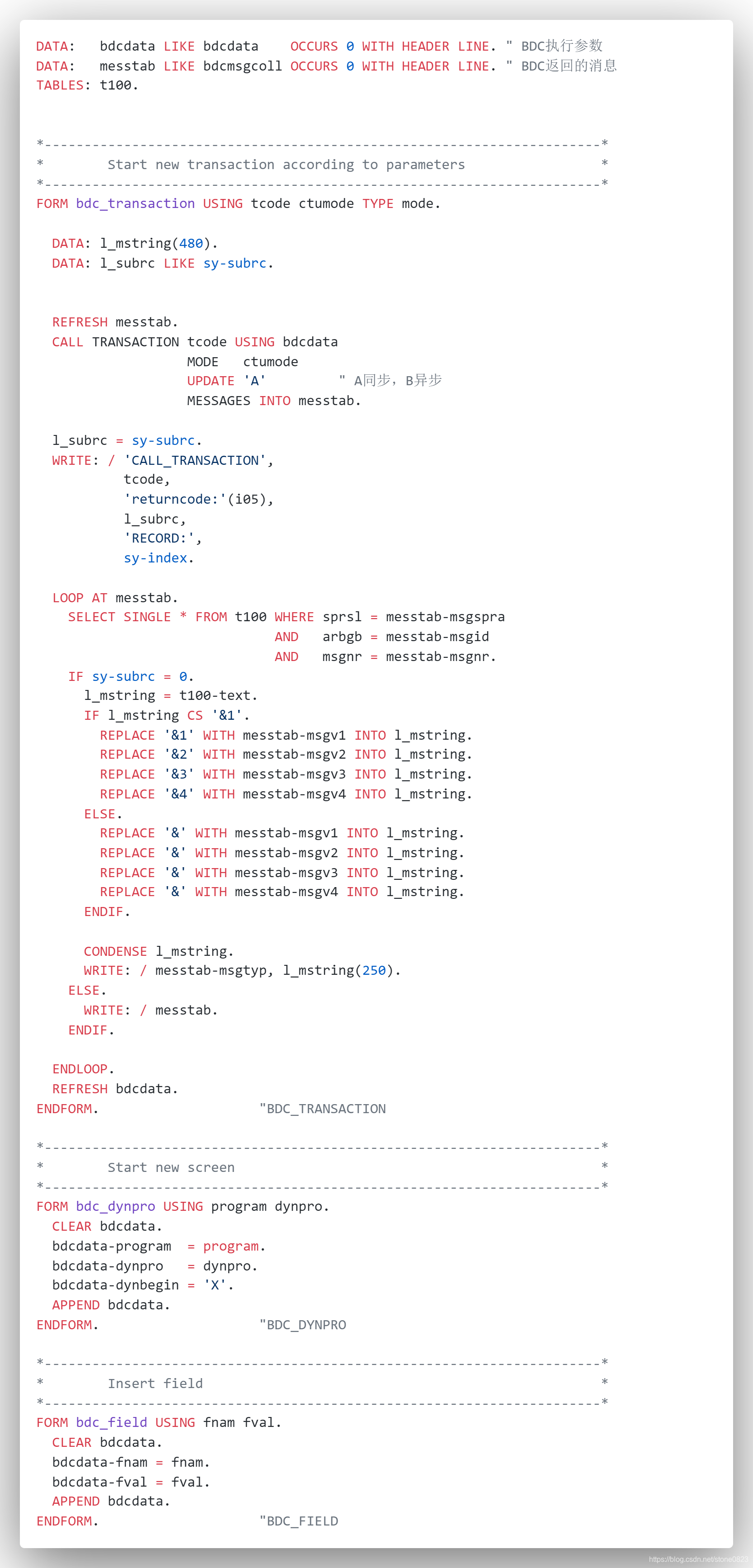 为了改写和完善这支程序,我们需要熟悉自动生成程序的逻辑。这里我就不分析程序的细节了,直接说明方法。SAP 将 BDC 程序的通用功能写在 include 程序 BDCRECX1 中,我们将 BDCRECX1 拷贝为一个新的程序 ZBDCRECX,保留 BDC_DYNPRO, BDC_FIELD 和 BDC_TRANSACTION 三个子程序,并且进行适当的改写。完成后代码如下: