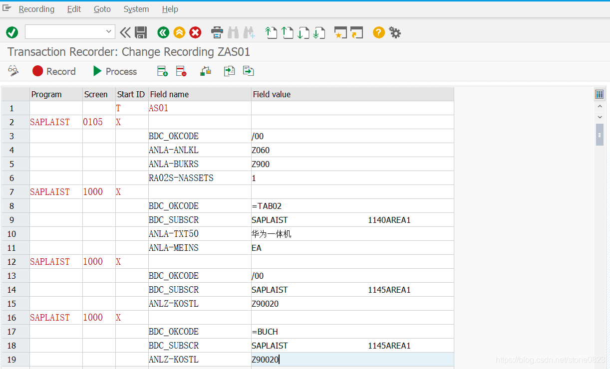 录制的过程中,就是事务码 AS01 的操作过程。要点就是对每一个需要输入值的字段都手工输入,不要从历史记录中选择;完成录入后,点击保存按钮保存保存数据,保存动作也需要被记录下来;避免录入的时候在不同的屏幕中跳来跳去,因为 SAP 会记录屏幕和光标 (Cursor)的位置,反复跳转产生一些无关的脚本代码,增加了后续处理的难度。这里省略录制的过程。录制完成后,SHDB 的界面如下:
