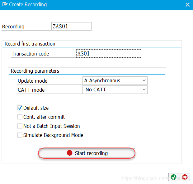在弹出对话框中,输入 recording 名称(ZAS01) 和事务码 (AS01),点击 Start recording 按钮开始录制。