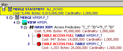 其实子查询中通过id关联实际上类似于相关子查询,想到数据量,如果能够将两张表通过全表扫描,并用hash join关联应该是最快的。这时候想到了update内联视图或者采用merge两种方法。因为实际情况中p_t与c_t关联会产生重复数据,所以不能用update内联视图的方式,最终采用merge方式。实验环境中我采用两种方法进行优化,为了对比准确,没有加并行。虽然这样更新了整个p_t表,但是只扫描了c_t表一次。