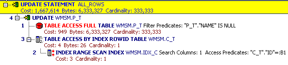 实验环境中我采用两种方法进行优化,为了对比准确,没有加并行。总结:update的优化如果可以改写成merge或者update内联视图的方式,适用于大数据量更新,避免采用单条更新,防止多次扫描子查询中的表。资源允许情况,可以开启dml和查询并行。内部是通过单条跟新的方式进行,从p_t中那出一条记录去c_t中匹配,c_t中采用索引扫描,然后再通过rowid访问表取到name。实际应用中,我将语句改写成