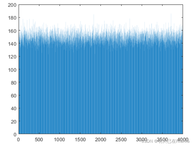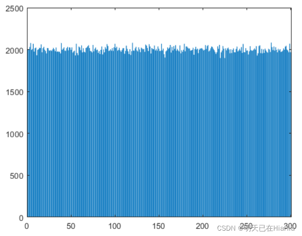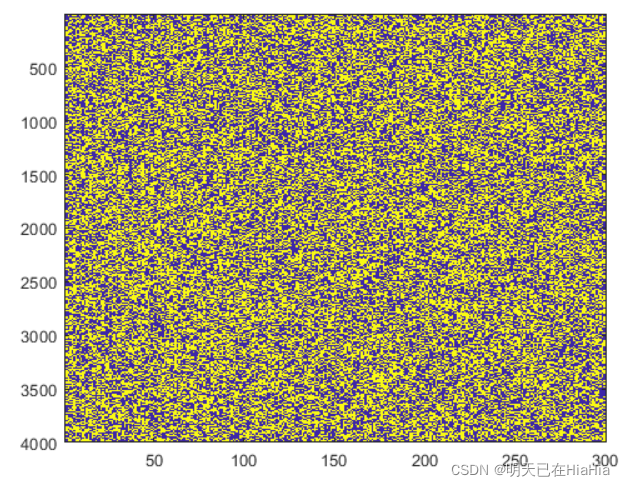 dim1 = 4000;dim2 = 300;z = rand(dim1,dim2)>0.5;imagesc(z)作图效果如下按照dim2做统计图如下h1 = bar(sum(z,1))按照dim1作图如下h2 = bar(sum(z,2))