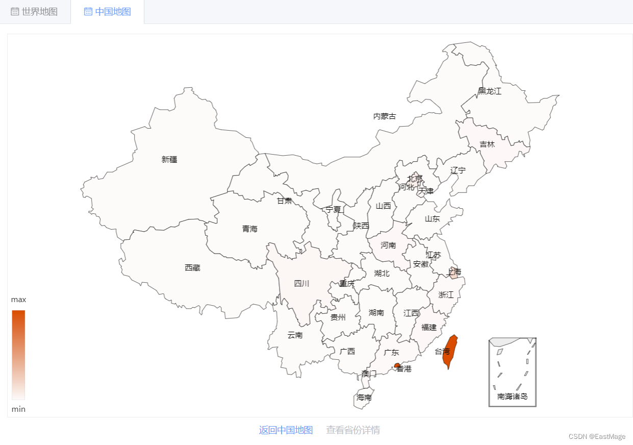 中国疫情地图相比世界疫情地图承载更多功能,因此其技术实现的难度也更高,相比世界地图echarts的绘制,中国疫情地图包含大量同步异步函数的使用,同时包含下钻(点击省份进入各省地图)和返回(回到中国地图),以及一些预想好的点击事件,其难度相对较高。中国地图并非使用像世界地图在echarts中直接调用。而是采用自定义地图,首先找到自定义的地图数据(json格式),包括中国地图以及各省份地图:数字代表各