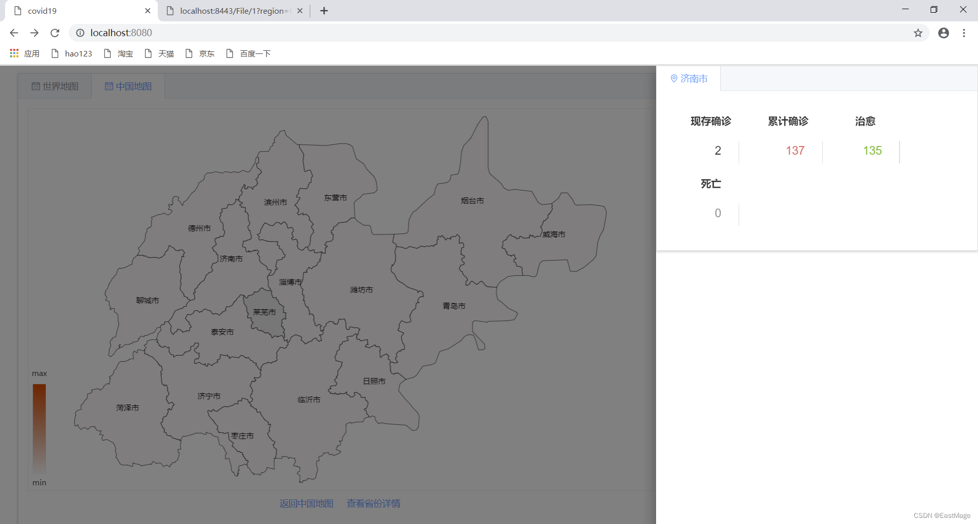 中国疫情地图相比世界疫情地图承载更多功能,因此其技术实现的难度也更高,相比世界地图echarts的绘制,中国疫情地图包含大量同步异步函数的使用,同时包含下钻(点击省份进入各省地图)和返回(回到中国地图),以及一些预想好的点击事件,其难度相对较高。