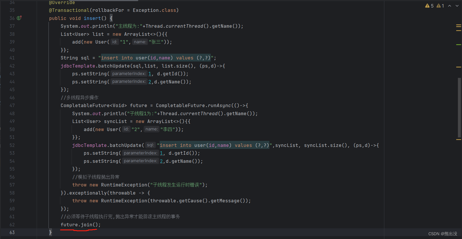 我们看到,主线程方法上由于加了 @Transactional(rollbackFor = Exception.class)声明式事务注解,事务回滚了,数据并没有插入。子线程虽然抛出异常,但是事务没有回滚,数据正常插入了!这不是我们想要的结果,再继续改进下: