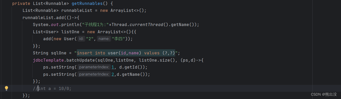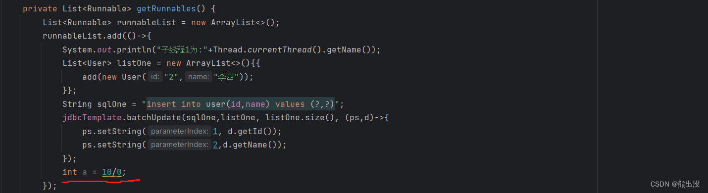 然后在子线程中加入编程式事务代码,手动管理子线程事务状态,发生异常后,回滚子线程事务,并抛出异常至主线程中(直接贴代码了,方便复制粘贴)
