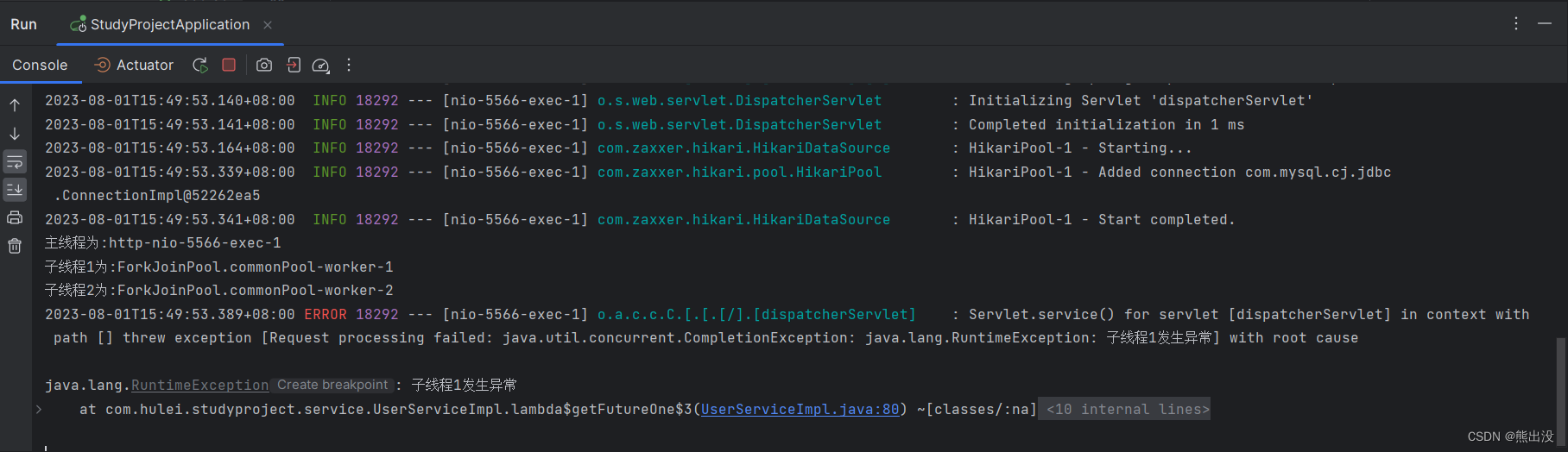 上面的代码中主线程调用了两个异步子线程,其中子线程一抛出异常,子线程二无异常,主线程阻塞等待两个子线程执行结果