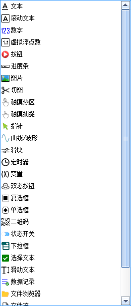 控件是串口屏想实现相关功能的“功能组件”,需要串口屏显示什么内容就使用相对应的控件。在串口屏上位机的界面编辑窗口中,一切你能看到的,都是控件。有三十种控件,常见的控件有,文本,按钮,数字,变量,滚动文本,切图等。
