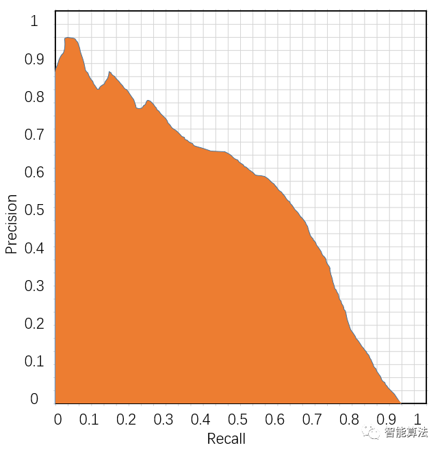 mAP是英文mean average precision的缩写,意思是平均精度均值,这个词听起来有些拗口,我们来仔细捋一捋。上面我们知道了什么是AP,AP就是PR曲线下面的面积(如下图),是指不同召回率下的精度的平均值。