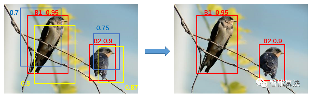 当存在多目标预测时,如下图,先选取置信度最大的候选框B1,然后根据IoU阈值来去除B1候选框周围的框。然后再选取置信度第二大的候选框B2,再根据IoU阈值去掉B2候选框周围的框。