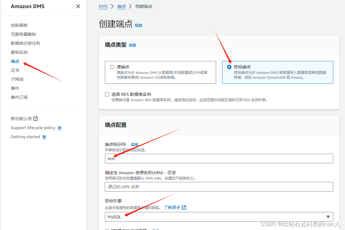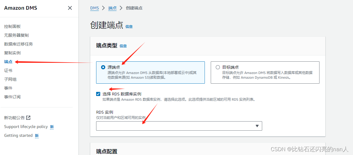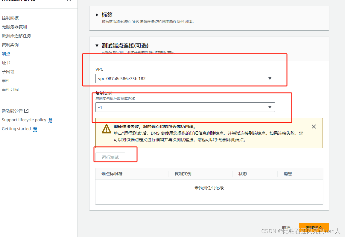 源端点直接选择默认,测试连接在选择同一VPC(复制实例没开公网的话),成功就可以创建端点。