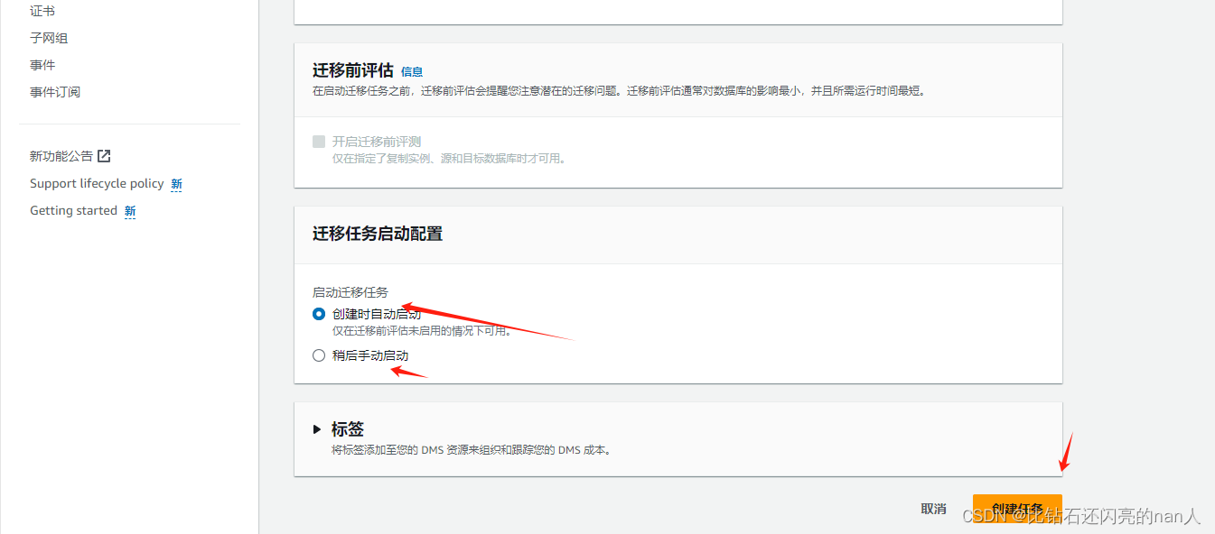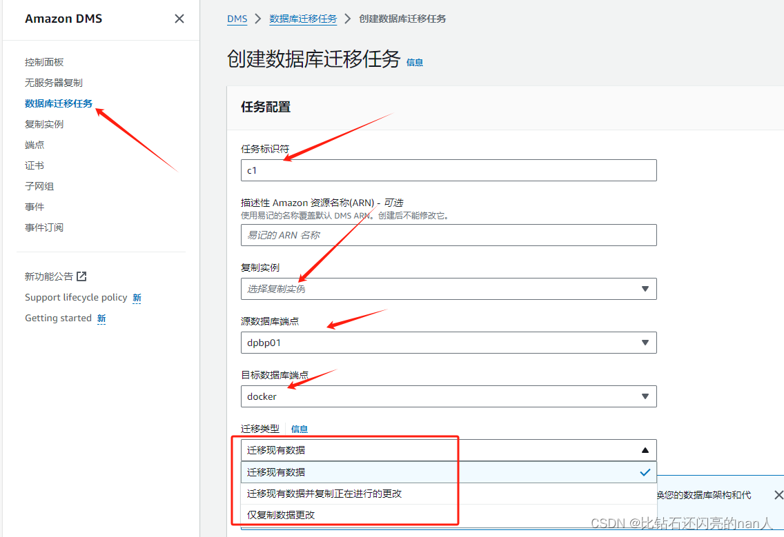 选择刚刚创建的那些内容,迁移类型,第一个是全量,第二是全量加持续增量,第三个是变化的数据