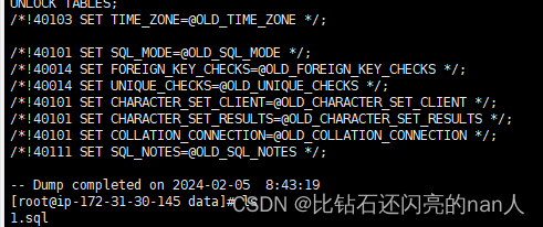 -h 172.31.30.145:指定 MySQL 服务器的 IP 地址。-u root:使用 root 用户进行连接,你可以替换为实际的用户名。-p:提示输入密码进行连接。test:指定要导入数据的目标数据库,你可以替换为实际的数据库名。< /data/1.sql:从/data/1.sql文件中读取 SQL 语句并执行。