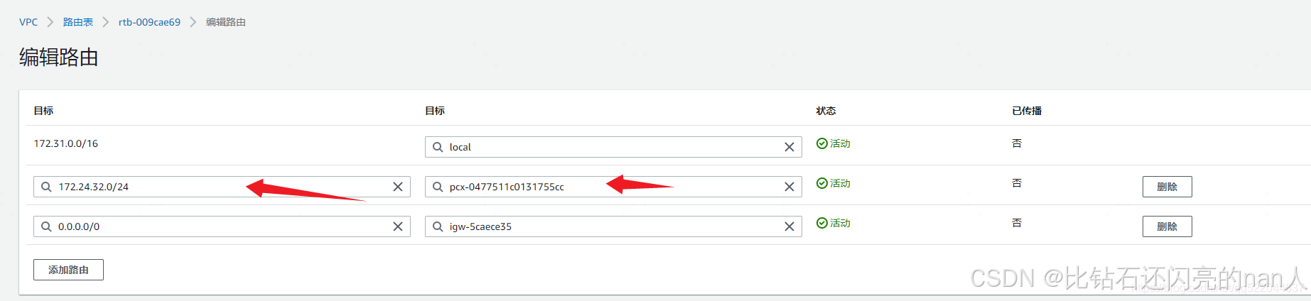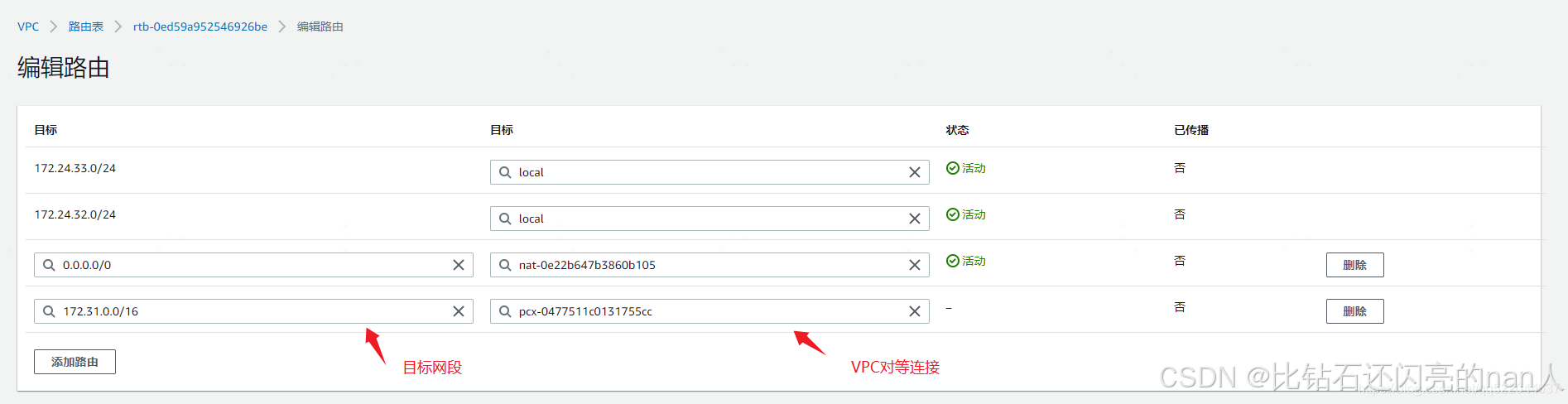 要将私有 IPv4 流量从实例发送到对等 VPC 中的实例,必须向与实例所在子网关联的路由表添加路由。此路由指向 VPC 对等连接中对等 VPC 的 CIDR 块(或 CIDR 块的一部分),并指定 VPC 对等连接作为目标。