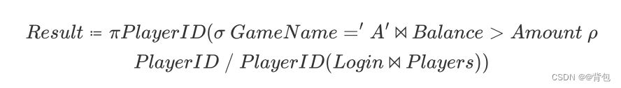 ρ PlayerID/PlayerID (Login ⨝ Players)这一步使用了ρ运算符,它的作用是对关系进行重命名。在这个公式中,我们将"Login ⨝ Players"的结果重命名为"PlayerID",也就是将结果中的PlayerID字段重命名为PlayerID。这一步的目的是为了更好地表达下一步的操作。 -