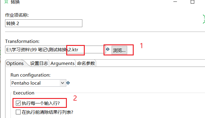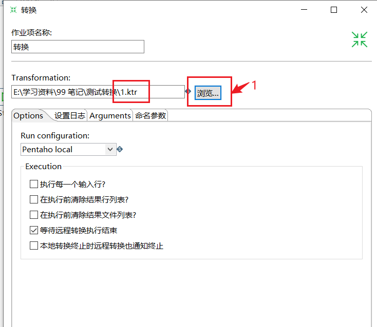 双击转换,在浏览处选择3.1建立的转换,如下图所示