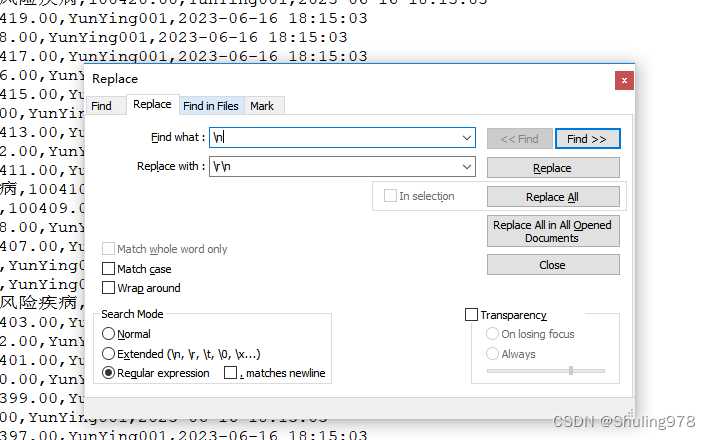 使用notepad++ 打开原csv文件,选择全局替换,如下图: