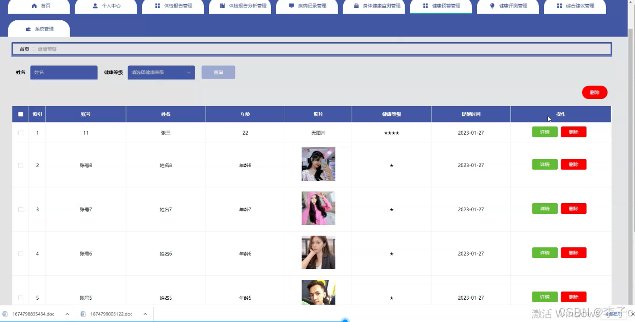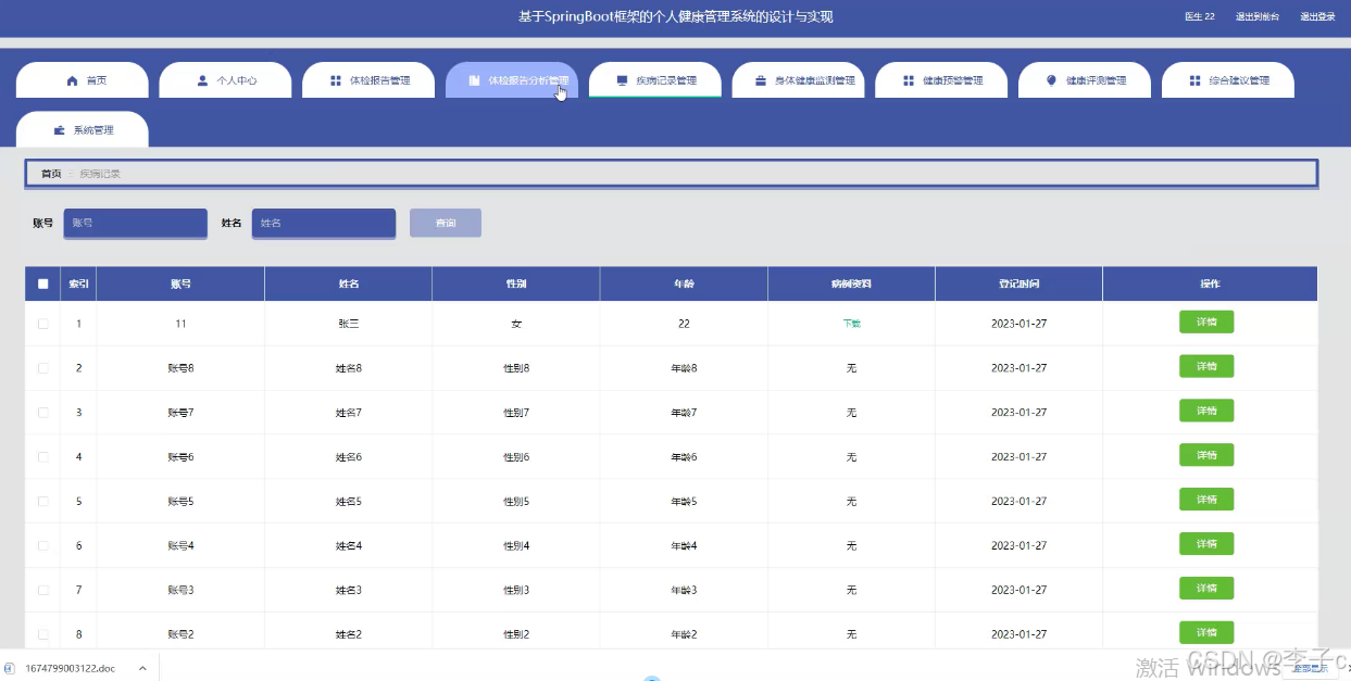 本研究旨在设计并实现一个功能全面、操作简便、易于扩展的个人健康管理系统。该系统将围绕用户、医生、体检报告、体检报告分析、疾病记录、身体健康监测、健康预警、健康评测及综合建议等核心功能展开,旨在构建一个集数据采集、分析、预警、建议于一体的健康管理平台。通过该系统,用户可以方便地记录和管理自己的健康数据,接收个性化的健康建议;医生则能基于系统提供的数据分析,为用户提供更加精准、高效的医疗服务。最终,实现用户健康管理的智能化、个性化与高效化,提升全民健康水平。