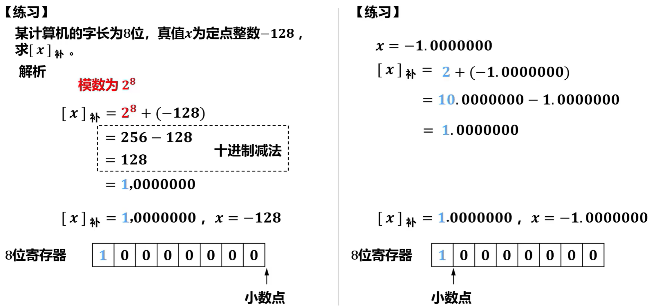 举例举例特殊情况现代计算机中多采用IEEE754标准表示浮点数,而其中的定点小数采用原码表示,因此通常不会涉及定点小数的补码表示。