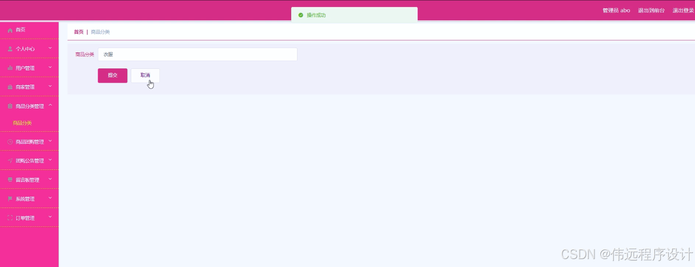The community group buying system developed this time has administrators, users and merchants. Administrator functions include personal center, user management, business management, commodity classification management, commodity group purchase management, group purchase announcement management, message board management, system management, order management, etc. Merchants can publish products and process orders. Users can register for group purchase products, view information and other operations.