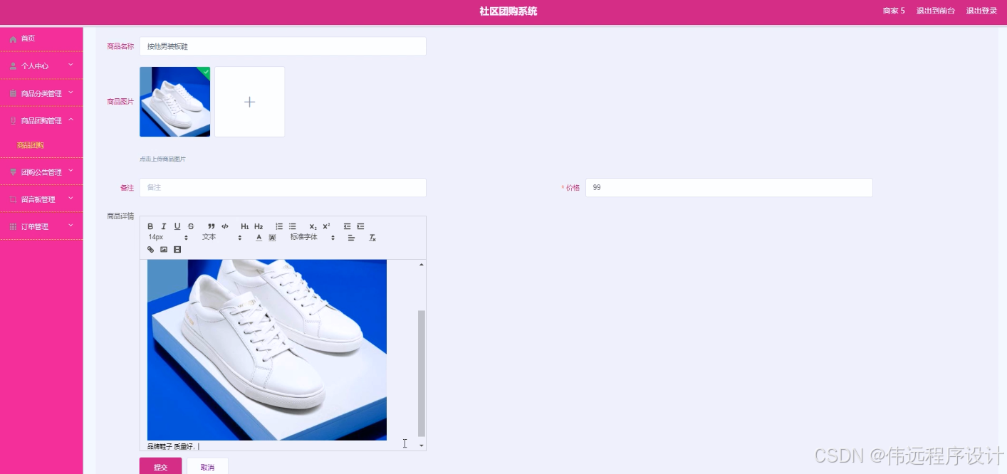 这次开发的社区团购系统有管理员,用户和商家。管理员功能有个人中心,用户管理,商家管理,商品分类管理,商品团购管理,团购公告管理,留言板管理,系统管理,订单管理等。商家可以发布商品,处理订单。用户可以注册登录团购商品,查看信息等操作。