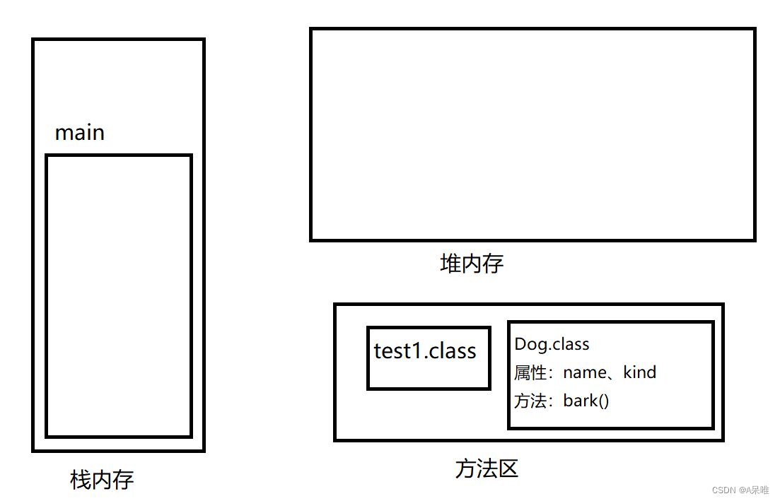 举个栗子先创建一个狗类,有属性狗的名字,狗的品种和方法让狗发出叫声,代码如下然后执行下面这段代码那么这段代码到底在内存中到底是怎麽执行的呢?首先,可以看到这段程序会先执行test1类,因此先将test1放到方法区,然后执行main方法,mian方法是在栈内存中执行,所以会在栈内存中创建main方法的栈帧main方法中的第一行代码首先创建一个狗对象,首先接触到的是狗类Dog,因此会将狗类也加载到方法