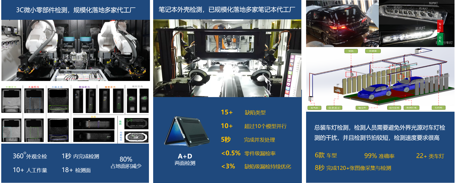 经过飞桨与产业伙伴多年的协同探索,实现各行各业的产业智能化升级,目前在很多行业的AI落地已经逐渐进入到深水区。在工业场景,大量中国领先的制造企业正在应用AI技术进行无人化厂房的改造,图7 展示了手机、笔记本和汽车不同体积的工业制品的智能质检系统,“工业摄像头+人工智能模型+自动化机械臂”已经成为无人化升级的标配方案,中国制造企业的AI升级速度超乎想象。