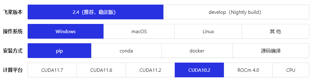 进入实践之前,请先安装飞桨。飞桨提供了图形化的安装指导,操作简单,详细步骤请参考 飞桨官网 -> 快速安装。进入页面后,可按照提示进行安装,如 图9 所示。举例来说,笔者选择在笔记本电脑上安装飞桨,那么选择(Windows+pip+CPU)的配置组合。其中Windows和CPU是个人笔记本的软硬件配置,pip是命令行安装的指令,Python需要提前安装好。