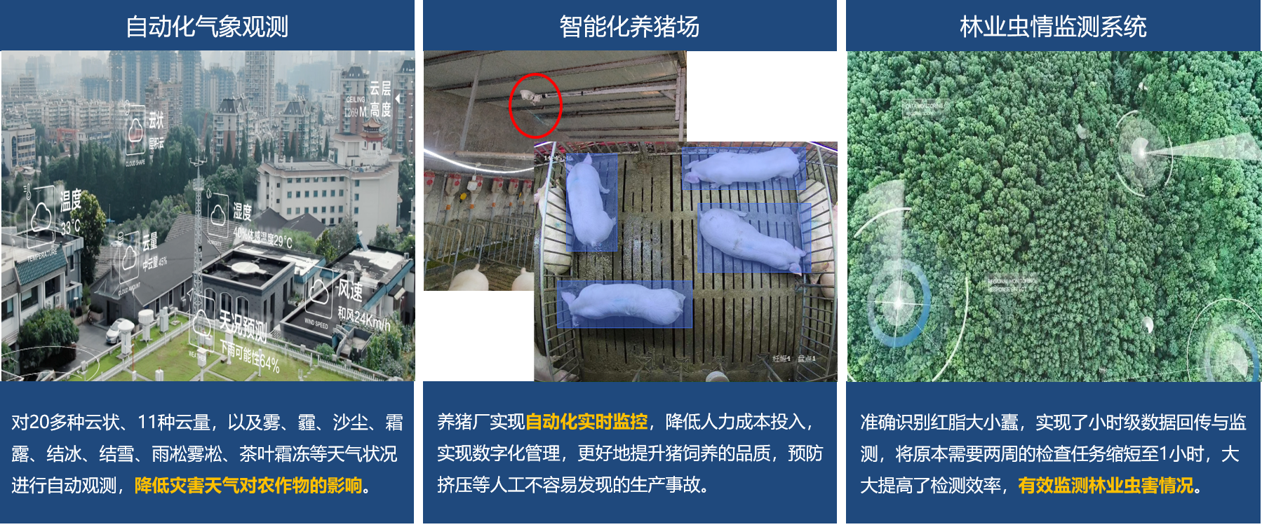 在农业场景,AI应用也是遍地开花。如:图8 第二个案例展示的智能化养猪场,对猪活动状态的自动监控已经成为常规应用。飞桨的合作伙伴甚至脑洞大开,开始研究“猪脸识别”和“牛脸识别”。初闻这个诉求时,笔者还十分惊讶,人类刚刚攻克人脸识别,为什么要研究猪脸识别呢?这来源于企业对牲畜科学化、精细化饲养的需求。目前畜牧业对畜群多数是放养的状态,但又需要精准投喂,很多猪在怀孕期和患病期需要投喂专门的饲料。但猪群中往往有一些“霸猪”,无论投喂什么饲料,它们都会把其他猪挤开先吃个饱。企业希望在养猪场的特殊食槽上方加入“猪脸识别”的系统,只有特殊时期的猪到达食槽前,食槽才会自动投放特殊食物。 如果不深入产业,这些AI应用场景真是难以想象。