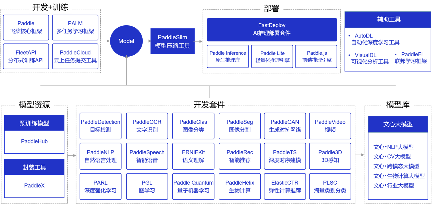 概览图上半部分是从开发、训练到部署的全流程工具;下半部分是预训练模型、封装工具、各领域的开发套件和模型库等模型资源,支持深度学习模型从训练到部署的全流程。