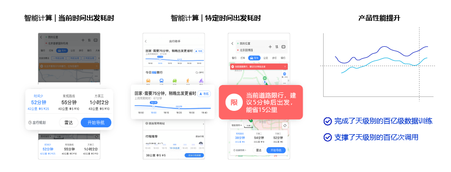 在百度,搜索、信息流、输入法、地图等移动互联网产品中大量使用飞桨做深度学习任务。在百度地图,应用飞桨后提升了产品的部署和预测性能,支撑天级别的百亿次调用。完成了天级别的百亿级数据训练,用户出行时间预估的准确率从81%提升到86%,如 图5 所示。