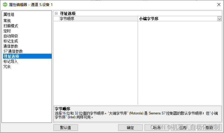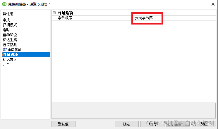 我们需要修改我们创建“设备”时的默认参数设置。选择创建的设备名称,单击右键,选择【属性】,在弹出的属性编辑器中选择【寻址选项】,我们可以看到此处字节顺序默认为“大端字节序”,我们需要将其改成“小端字节序”.