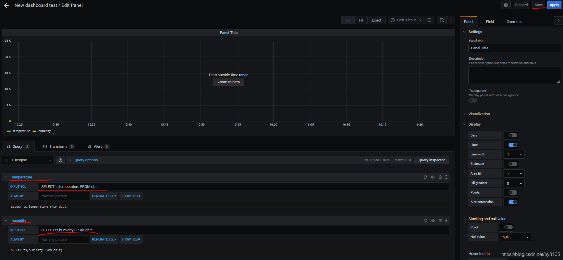 8)进入Grafana的web页面(http://192.168.174.130:3000),admin/admin,配置TDengine插件,创建一个空plane,创建两个查询: