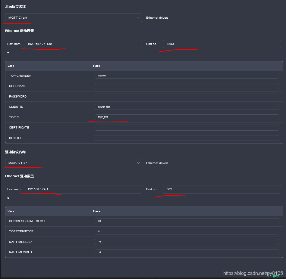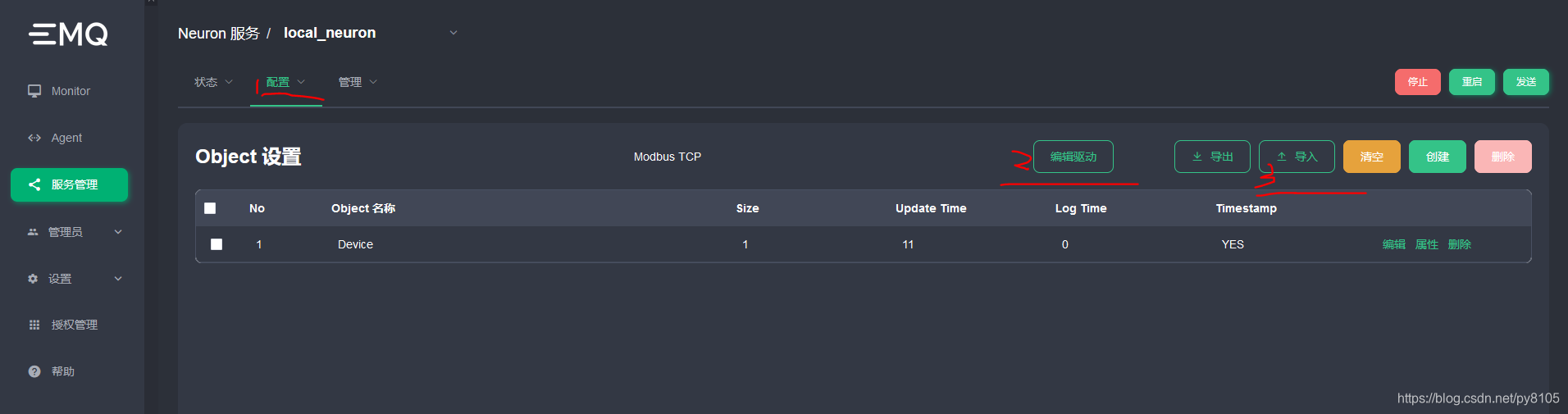 3)配置采集信息点,进入object设置页面,编辑驱动,并导入案例信息点,在edge-stack/develpoer-scripts下的neuron_batch_modbus_5.xlsx,完成配置后点击发送完成配置生效。