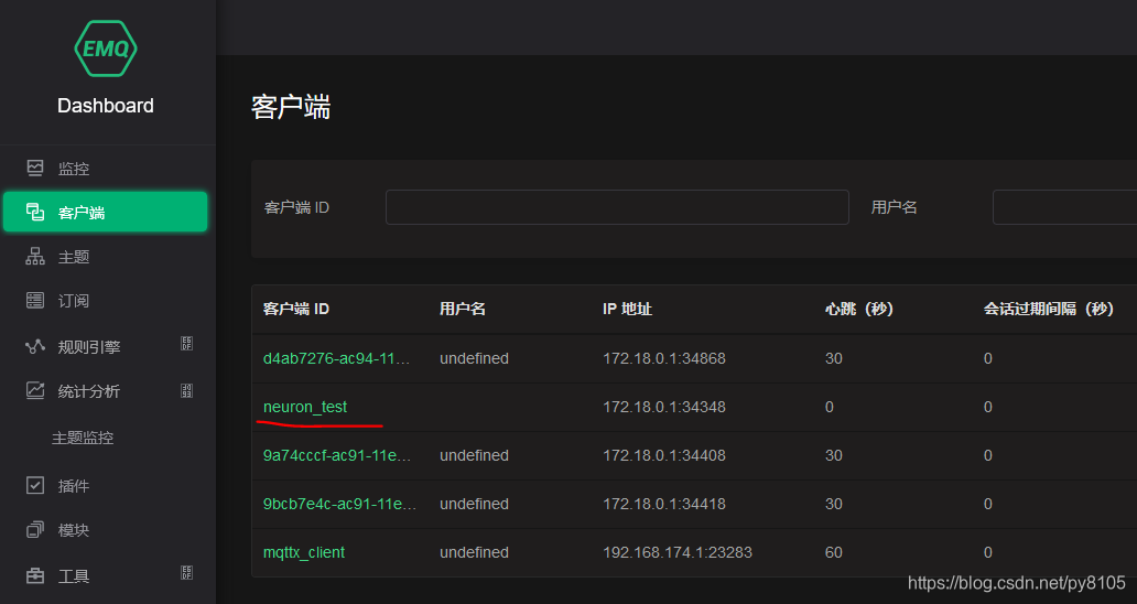 5)前往EMQX Edge查看Neuron是否作为客户端成功连接,并查看主题消息情况