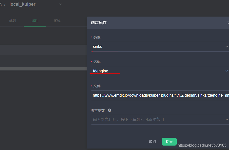 7) 进入kuiper的插件配置页面,先配置TDengine的插件,后面配置规则时,需实现输出数据写入TDengine数据库。