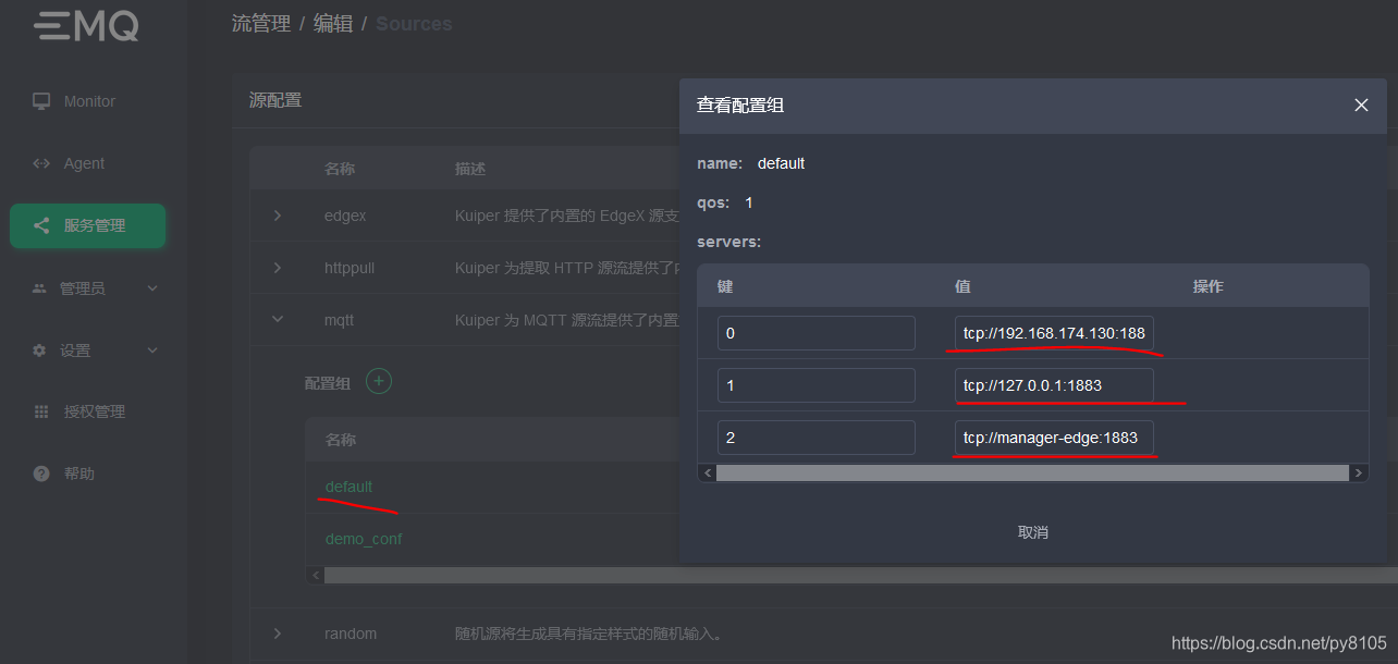 进入源配置,可以查看mqtt的默认配置就是我们前面修改docker-compose.yml时kuiper调整的信息(MQTT_SOURCE__DEFAULT__SERVERS: "[tcp://192.168.174.130:1883,tcp://127.0.0.1:1883,tcp://manager-edge:1883]")。